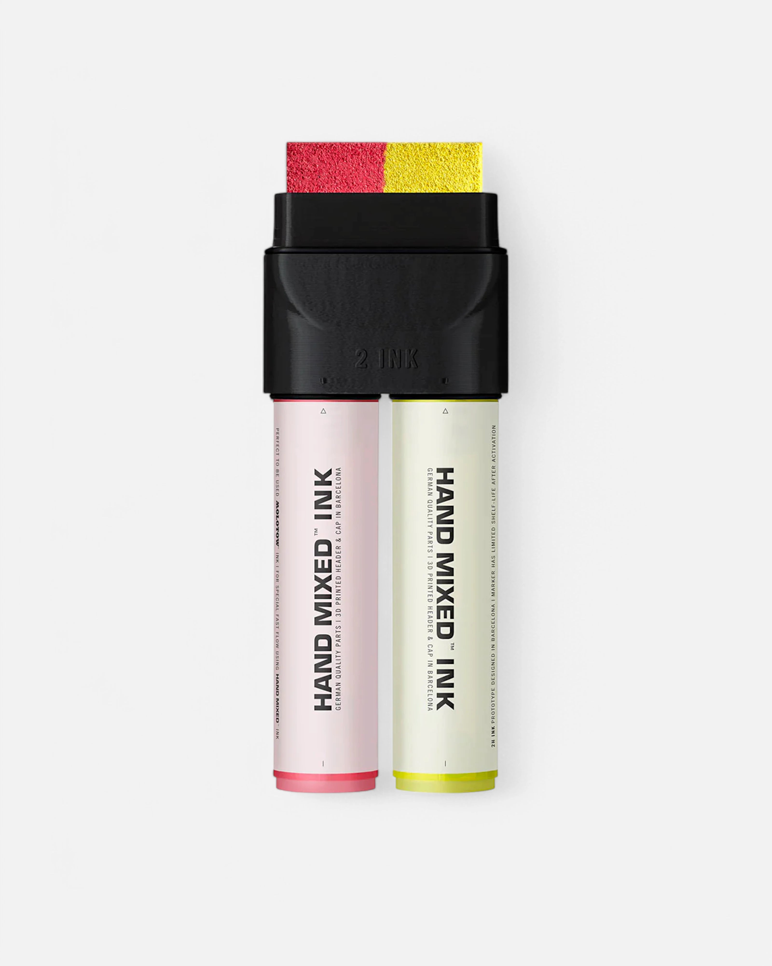 Porta le tue tag ad un livello superiore! HAND MIXED 2 Ink è il primo pump marker al mondo in grado di scrivere con due colori contemporaneamente. Progettato da Hand Mixed Labs a Barcellona e realizzato con componenti e materiali di alta qualità, può essere caricato con il tuo inchiostro a base d’alcol preferito o con un inchiostro a base d’acqua. Dispone di una punta da 38mm prodotta in Giappone, con testa e cappuccio stampati in 3D. L'inchiostro al suo interno è "Hand Mixed Ink", una vernice laccata a base alcolica, che una volta asciutta presenta una finitura lucida.