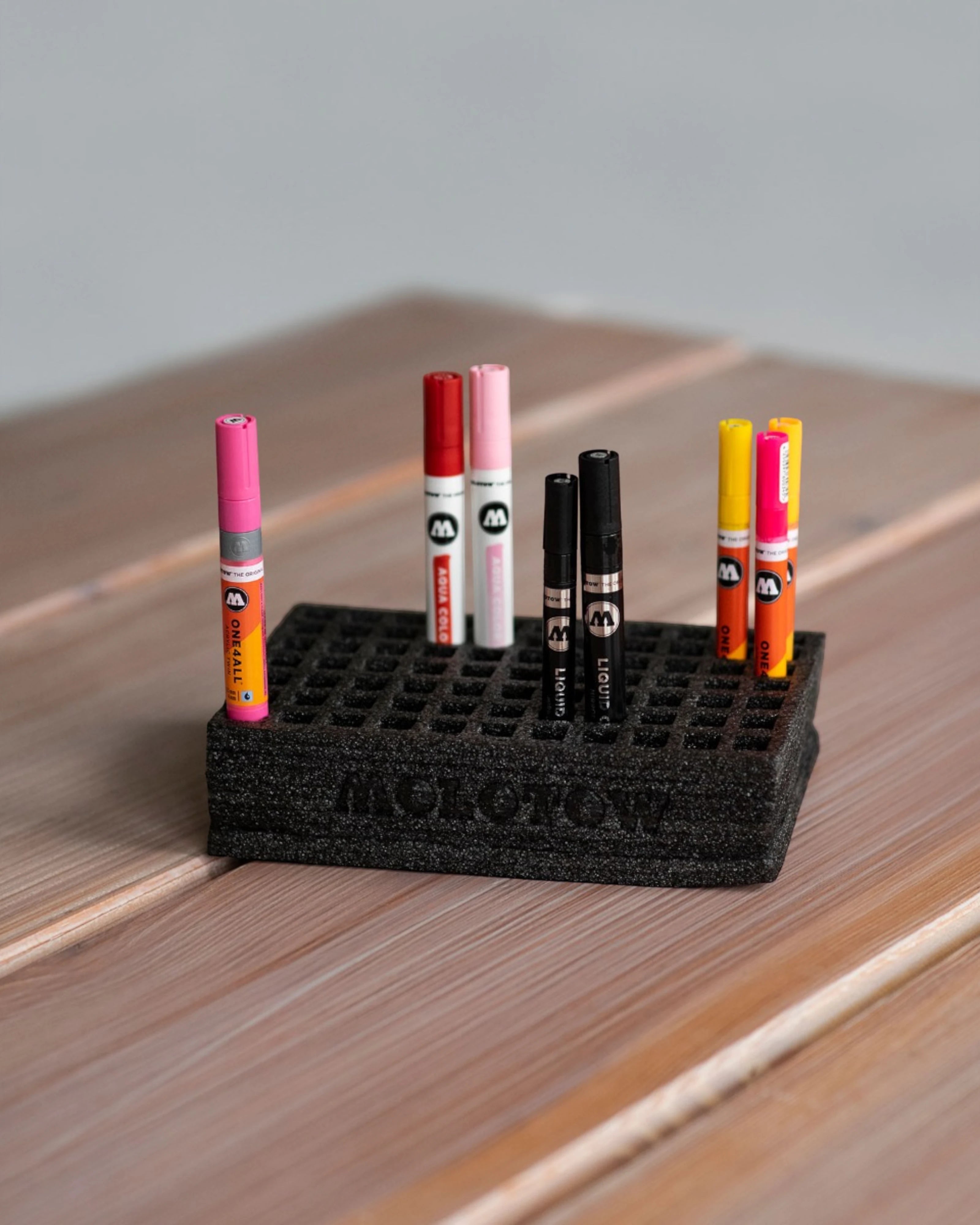 Pratico organizzatore Molotow per tavoli da disegno che offre ampio spazio per marker e penne. All'occorrenza questo organizer in schiuma può essere tagliato a misura per essere collocato in scaffali o tavoli di diverse misure.